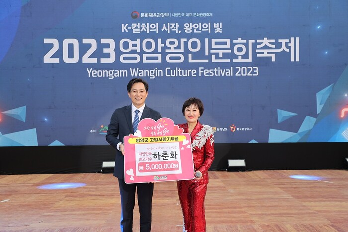 4년 만에 개최된 영암왕인문화축제를 응원하기 위해 지난 3월 31일 직접 축제장을 찾은 가수 하춘화는 기부금 전달은 물론 국립마한역사문화센터의 영암군 유치를 기원하는 음악회에 함께 하며 많은 이들에게 감동을 선사했다.