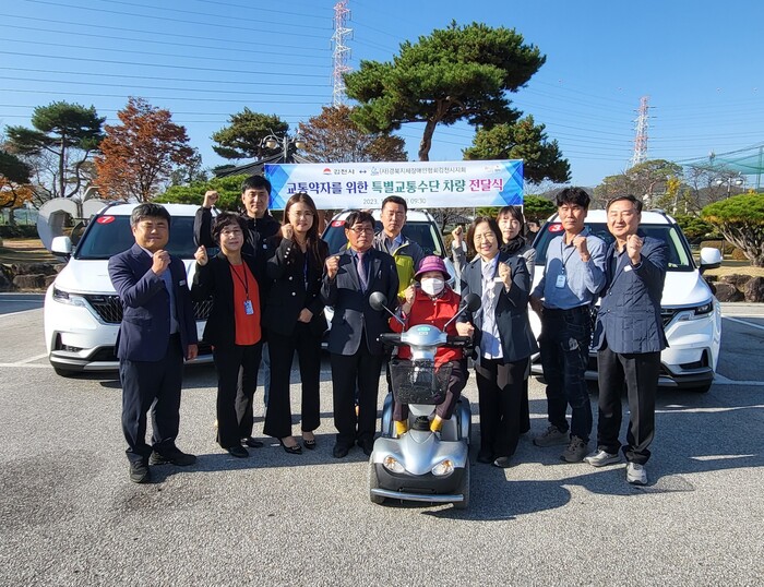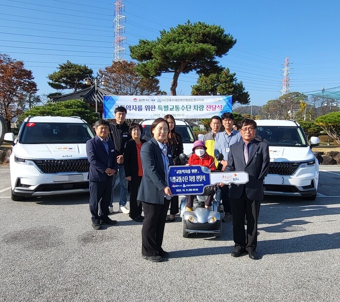 [김천=박병상 기자] 경북 김천시는 10월 31일 김천시 교통약자 이동지원센터에서 교통행정과장, 경상북도지체장애인협회 김천시지회장을 비롯한 관계자가 참석한 가운데 추가 증차 된 차량 3대에 대해 전달식을 했다.