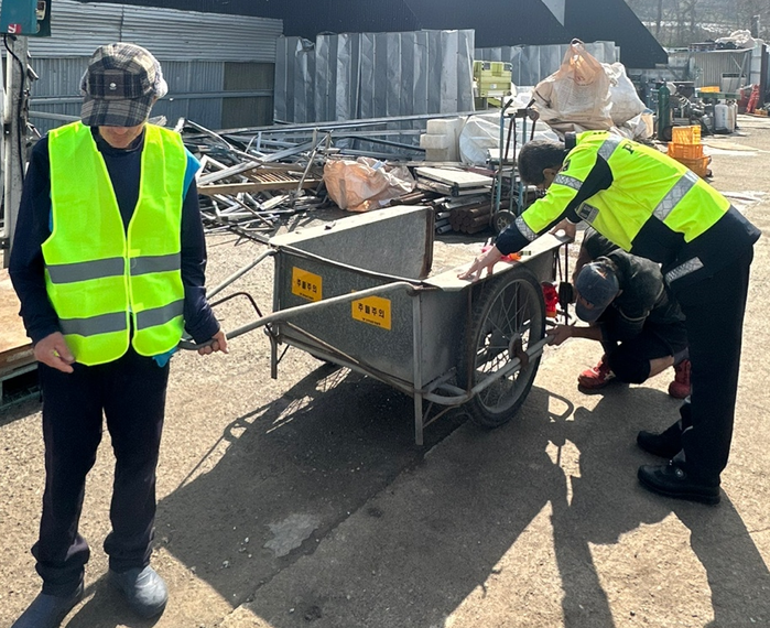 [무안=황승순 기자]무안경찰서(서장 정성일)는 지난 4월 14일 야간 시간대 교통 사고 위험에 상시 노출된 생계형 고령 보행자들의 안전 확보를 위해 폐기물 수집업체와 협력하여 폐지 수거 활동 중인 고령자들을 직접 발굴하여, 리어카 및 보행 보조용 의자차 등에 형광반사조끼, LED 점멸등, 태양광 자동 점멸장치 (일명 ‘쏠라뱅뱅이’)를 부착해주는 맞춤형 교통안전 시책을 추진했다고 밝혔다.