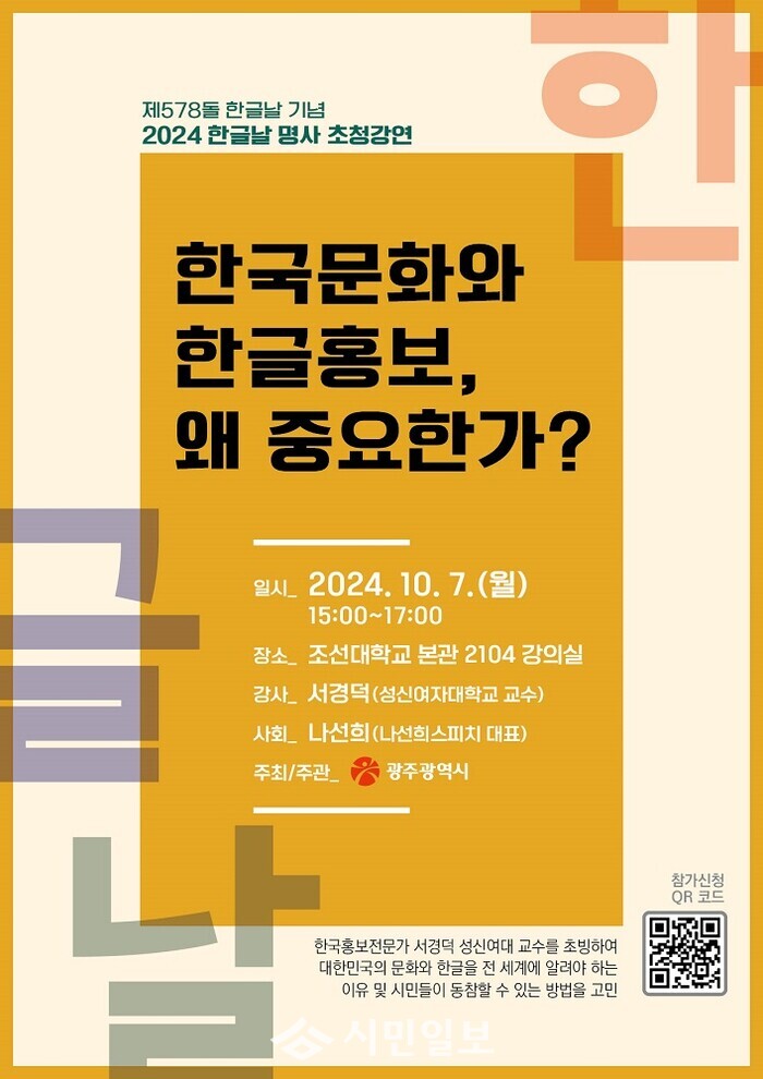 이날 강연은 누구나 무료로 참여할 수 있으며, 광주시 누리집 공지사항에서 정보무늬(QR코드)로 사전 접수하거나 현장에서 신청할 수 있다.