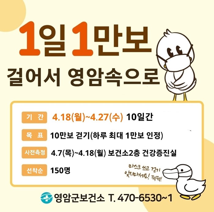참여자들에게는 올바른 건강 습관을 형성할 수 있도록 건강정보를 제공해주며 ‘걸어서 영암속으로 챌린지’ 1회(18일~27일)는 10일 동안 총 10만 보를 달성한 참여자에게 쿠폰제 선착순 150명에게 소정의 상품을 증정할 예정이다.