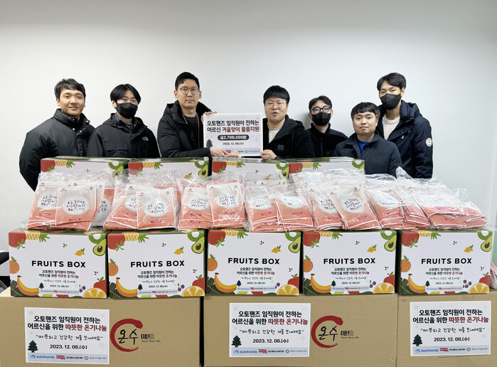 오토핸즈 강귀호 대표는 “구립 영등포노인복지센터와 함께 전달해드린 작은 정성이 취약계층 이웃들에게 따뜻한 겨울나기에 도움이 되길 바란다”며, “앞으로도 오토핸즈는 다양한 사회공헌 활동을 통해 지역사회에 보탬이 되는 기업으로 성장해 나가겠다”라고 말했다.