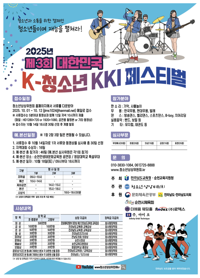 청소년상상위원회(대회장 이상대)가 개최하는 “2025년 제3회 대한민국 K-청소년 끼 페스티벌”를 오는 10월18일(토) 오전 10시부터 18시까지 순천만생태문화교육원 공연장에서 펼쳐진다고 전했다.