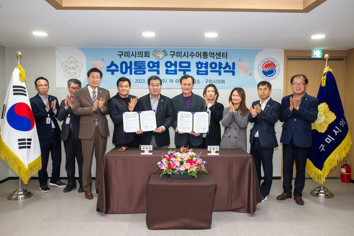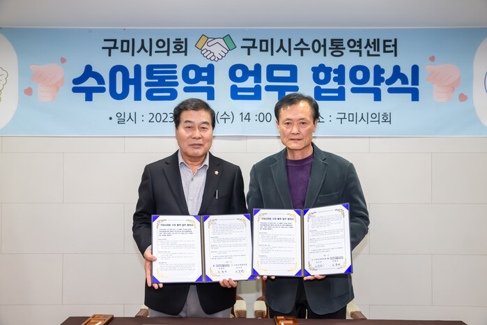 [구미=박병상 기자] 경북 구미시의회(의장 안주찬)는 지난 13일 오후 2시 의장실에서 2024년도부터 실시되는 본회의 수어 통역 업무를 위해 구미시수어통역센터와 업무 협약식을 진행했다.