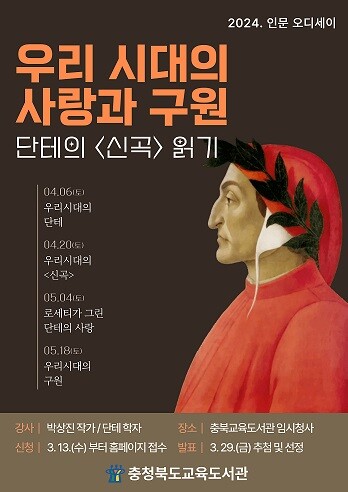 이번 강연은 <우리 시대의 사랑과 구원>이라는 주제로 ▲4월 6일(토) 우리 시대의 단테 ▲4월 20일(토) 우리 시대의 <신곡> ▲5월 4일(토) 로세티가 그린 단테의 사랑 ▲5월 18일(토) 우리 시대의 구원 등 4월부터 5월까지 매월 첫째, 셋째 토요일 오전 11시에 진행된다.