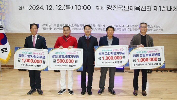 특히 이날 행사에는 강진을 사랑하고 응원하는 마음을 모아 유태경 이통장연합회 영암군 지회장, 김상현 광성타올나라 대표, 서경옥 목포한국뷔페 대표가 각 100만 원, 김길남 삼성기술(주) 대표가 50만 원의 고향사랑기부금을 기부해 의미를 더했다.