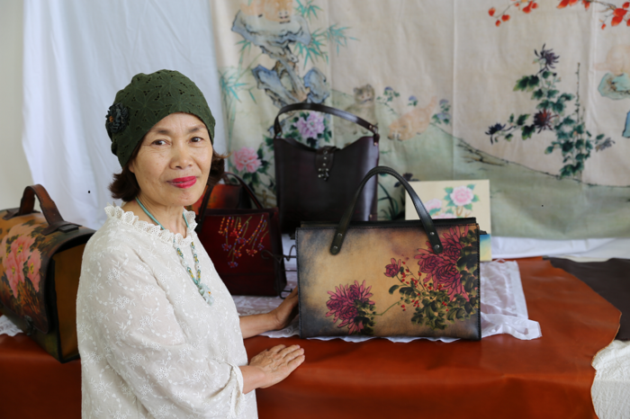 | ▲ 윤춘영 공예작가와 가죽공예작품 가방 / 사진=강진군 제공 |