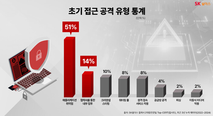 SK쉴더스는 지난 3년간 가장 많이 발생한 사이버 공격 유형으로 '애플리케이션 취약점 악용'(51%)을 꼽았다. 이어 협력사를 통한 내부침투(14%)와 크리덴셜 스터핑(10%) 공격 순으로 나타났다. 이는 외부에 노출된 취약점 관리만 철저히 해도 상당수의 침해사고를 예방할 수 있다는 의미다.