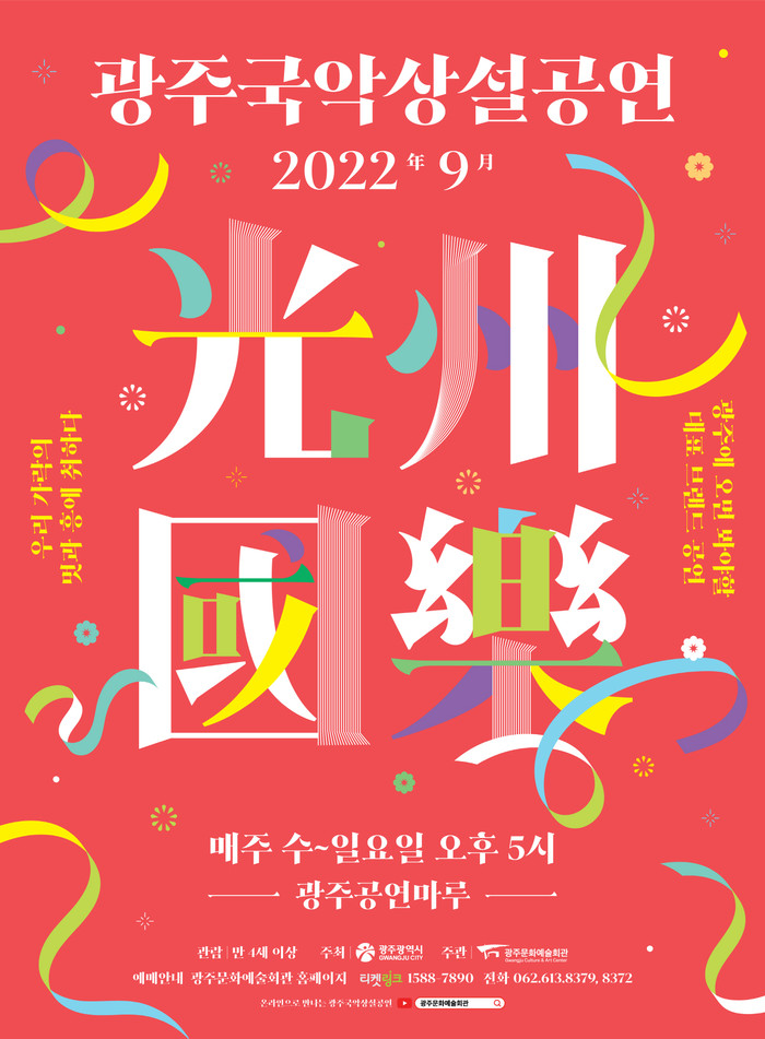 이밖에도 9월 한 달 간 전통예술의 멋을 한자리에서 만나볼 수 있는 다채로운 국악공연으로 관객과 만난다. 광주국악상설공연은 전통국악, 창작국악, 국악마술극, 미디어아트와 만난 국악 등 국악의 모든 즐거움을 남녀노소 누구나 만나볼 수 있는 광주 대표 브랜드 공연이다. 매주 수~일요일 오후 5시 광주공연마루에서 열리며, 시립예술단과 민간예술단체가 참여한다.