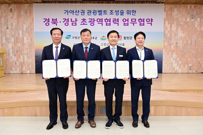 [고령=박병상 기자] 경북 고령군(군수 이남철)은 지방화시대를 맞이하여 지역 주도의 관광 연계협력 사업을 시도하고자 지난 15일(금) 군청 대가야홀에서 가야산을 인접하고 있는 4개 지자체와 연계한 초광역 협력을 위한 업무협약식을 개최했다.