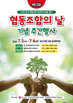 [부산=최성일 기자] 부산시(시장 박형준)는 「2024년 협동조합의 날(7.6.)」을 맞아 오늘(3일)부터 내일(4일)까지 시청 국제회의장 등에서 협동조합의 가치를 알리기 위한 「협동조합의 날 주간행사」를 개최한다고 밝혔다.