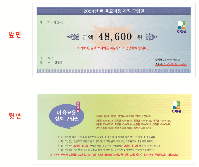 | ▲ 육묘구입권 전후면 / 강진군 제공 |