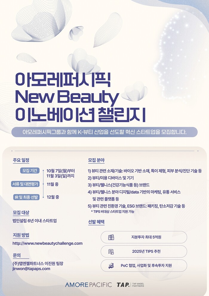 아모레퍼시픽은 이번 챌린지를 ‘탭엔젤파트너스’와 협력해 진행한다. 창업 기업 모집부터 최종 선발까지 액셀러레이터의 보육 전문성과 노하우를 연계해, 챌린지의 효과성과 효율성을 극대화할 계획이다.