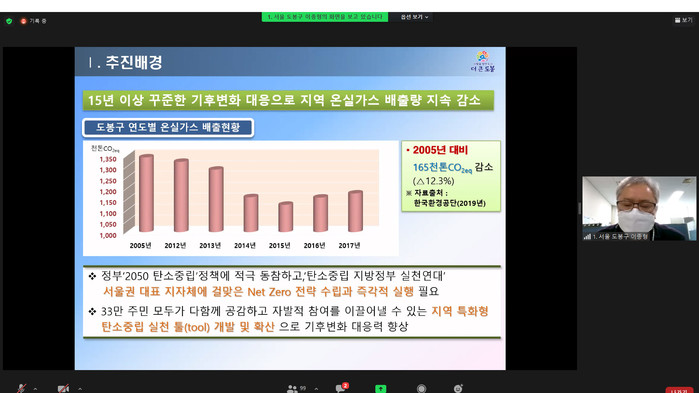 ZOOM과 유튜브를 통해 비대면으로 진행된 이번 성과보고회는 지자체 탄소중립 추진 우수사례를 발굴하여 공유하고 확산하고자 개최됐으며, 32건의 지자체 탄소중립 추진 사례 중 도봉구를 포함한 12개의 기초지자체 및 광역시도의 사례가 우수사례로 선정됐다.