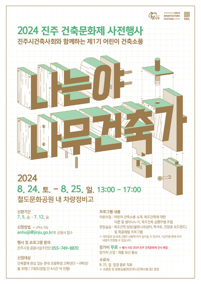 행사는 8월 24일과 25일 이틀 동안 오후 1시부터 5시까지, 하루 4시간씩 진행된다. 이론 수업으로 △목조건축에 대한 이론 및 생각 나누기, △목조건축 실물모형 조립이 진행되며, 현장 실습으로 △진주시 목조건축(물빛나루쉼터·촉석루·진양호 우드랜드) 탐방, △목공 체험 프로그램 등이 진행된다. 행사 후 어린이들의 체험 사진은 9월 초 진주대첩광장에서 개최 예정인 ‘2024 제3회 진주 건축문화제’에 전시된다.