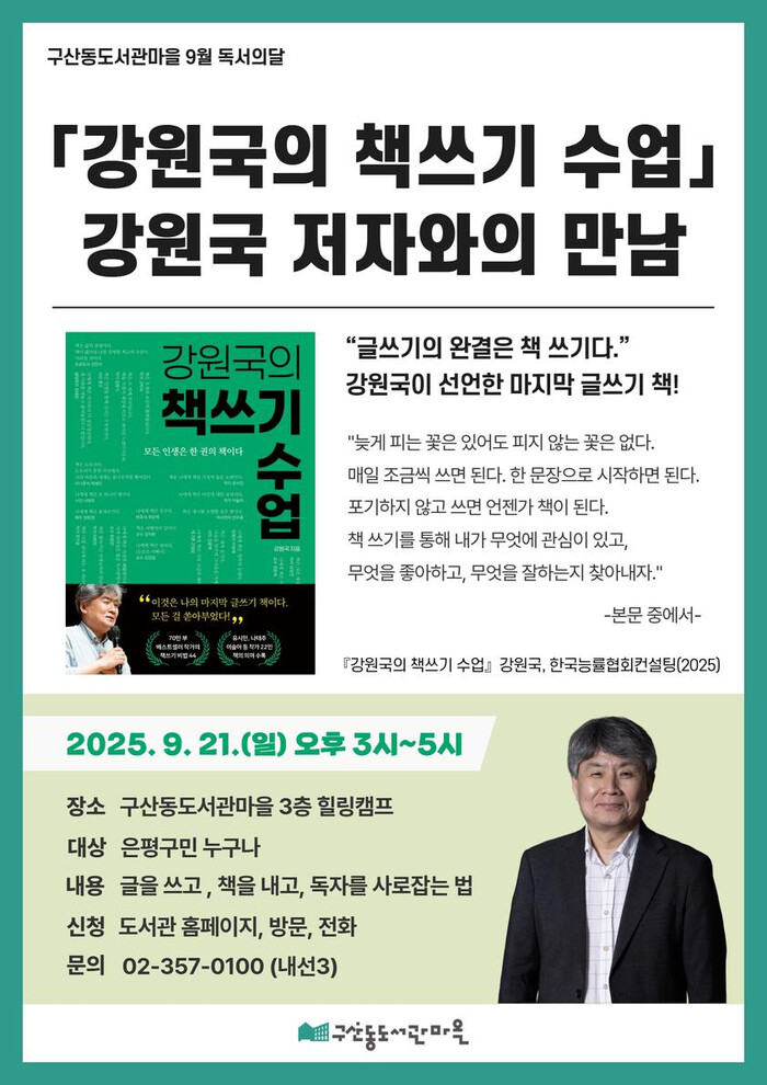 [시민일보 = 이대우 기자] 서울 은평구(구청장 김미경)는 구산동도서관마을에서 오는 21일 오후 3시에 ‘강원국의 책쓰기 수업’ 강원국 저자와의 만남을 개최한다고 밝혔다.