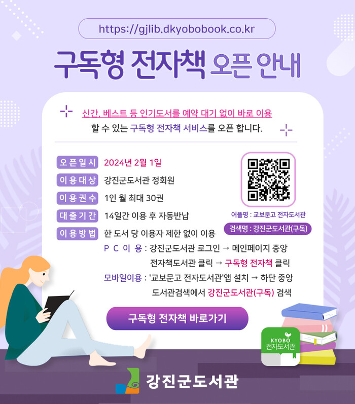 강진군도서관 정회원에 등록한 강진군민은 누구나 이 서비스를 이용할 수 있다. PC를 활용해 구독형 전자책을 보려면 강진군도서관 누리집에 로그인 후 메인페이지 중앙 ‘전자책 서비스’를 클릭하면 된다.