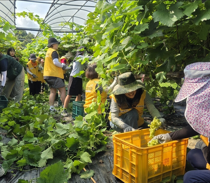 이날 봉사활동에는 총 40명의 봉사자가 참여해 본격적인 수확 철을 맞은 캠벨과 청수로 등 포도 수확과 선별 작업을 도우며, 농가의 일손 부족 해소에 힘을 보탰다.