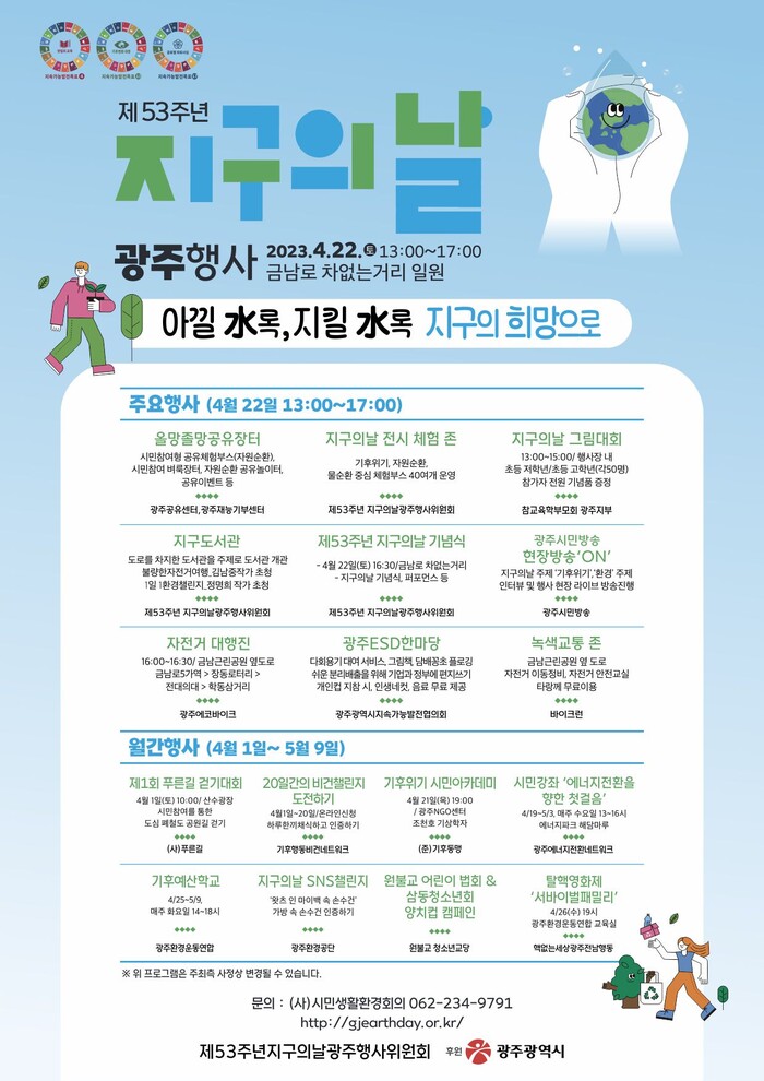 ‘지구의 날’ 기념식은 55개 기관·단체가 참여한 제53주년지구의날광주행사위원회 주관으로 오후 4시30분 YMCA앞 무대에서 ‘아낄水록, 지킬水록 지구의 희망으로’를 주제로 열린다.