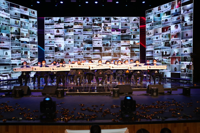 | ▲ 지난해 열린 '4.19혁명 국민문화제 2021'에 참여한 내빈과 시민 419명이 희망메시지 가 적힌 기념수건을 펼치고 있다. |