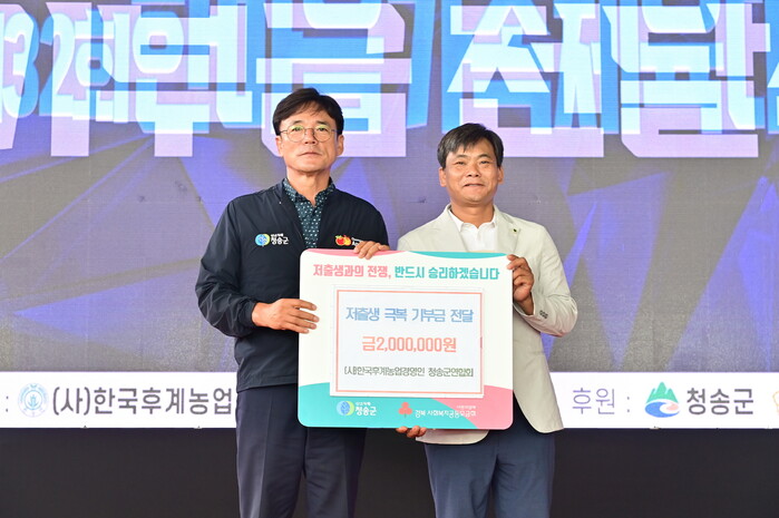 [청송=박병상 기자] 청송군(군수 윤경희)은 (사)한국후계농업경영인 청송군연합회(회장 심천택)가 지난 26일 한마음가족체육대회 행사에서 저출생 극복을 위한 기부금 200만원을 기탁했다고 밝혔다.