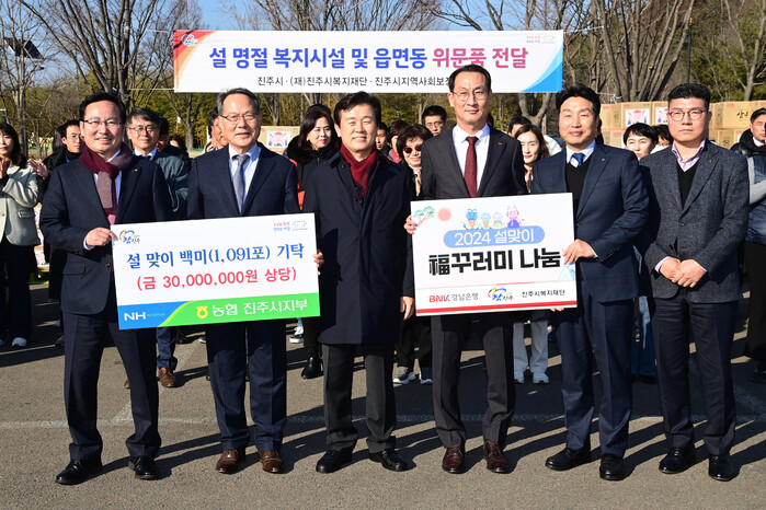 이날 기부된 물품은 갑진년 설날을 맞아 지역금융기관인 BNK ㈜경남은행(서부영업본부장 구태근)과 NH농협은행㈜ 진주시지부(지부장 김정구)의 사회공헌활동의 일환으로 마련됐으며, 읍·면사무소 및 동행정복지센터를 통해 관내 저소득계층 600가구(환가액 6,000만여 원)에 전달될 예정이다.
