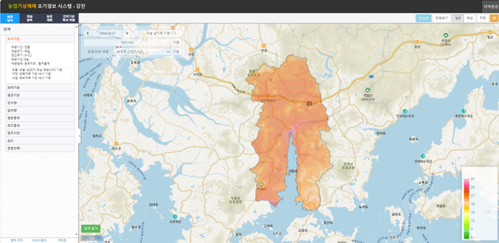 ‘기상·재해 조기 경보 서비스’의 가장 큰 특징은 기존 읍·면 단위의 기상청 동네예보(5㎞×5㎞) 보다 훨씬 더 상세화(30m×30m)된 ‘농장 단위’의 기후에 초점을 맞췄다는 것인데, 농장의 고도, 지형, 지표면의 피복 상태 등에 맞춘 상세한 기상 정보를 제공한다.
