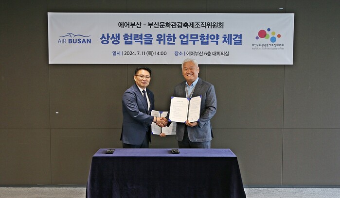 에어부산은 지난 11일 오후 부산 강서구 소재 에어부산 본사에서 부산의 대표적인 축제를 주관하는 부산문화관광축제조직위원회(이하 축제조직위)와 업무 협약을 체결했다. 협약식은 에어부산 마호진 영업본부장과 축제조직위 고인범 집행위원장을 비롯한 양사 관계자들이 참석해 진행되었다.