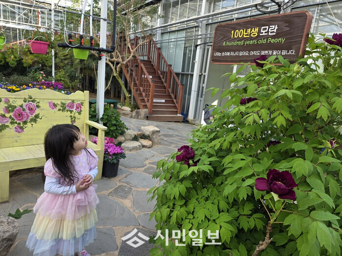 | ▲ 100s년생 모란을 관찰하고 있는 어린이 관람객 / 강진군 제공 |