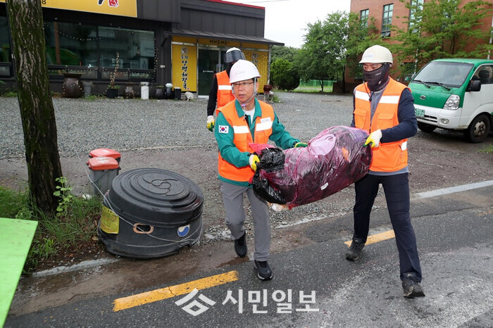 | ▲ 박병규 광산구청장(왼 쪽)이 생활폐기물 수거 현장을 찾아 환경직 노동자들과 종량제 봉투를 나르고 있다./ 광주광역시 광산구 제공 |