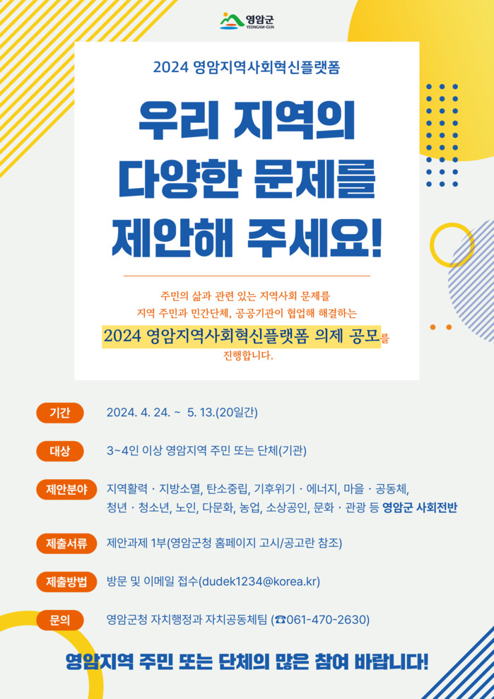 영암군 관계자는 “민관협력으로 지역 문제를 해결하는 첫 단계인 의제 공모에 많은 관심과 참여를 바란다. 지역사회 다양한 주체의 참여와 협력으로 혁신의 문화를 함께 만들자”고 전했다.