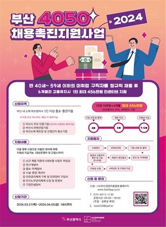 신창호 시 디지털경제혁신실장은 “이번 사업은 부산 경제의 허리층인 40.50대를 위한 양질의 일자리창출과 고용안정을 위한 것”이라며, “부산 중소·중견기업의 많은 관심과 참여를 부탁드리며, 우리시는 앞으로도 40.50대의 일자리 창출을 위한 다양한 시책을 펼쳐 나갈 것”이라고 밝혔다.