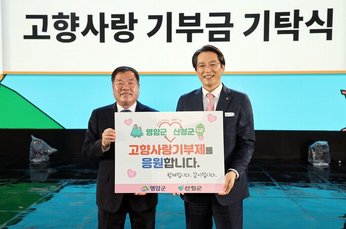 지난해 6월 우승희 영암군수는 산청군을 찾아 고향사랑기부제 활성화 업무 협약을 체결하고, 2,000여 만 원의 고향사랑기부금을 전달했다.
