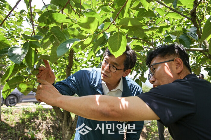 | ▲ 우승희 영암군수(왼 쪽) 대봉감 낙과 피해 점검 / 영암군 제공 |
