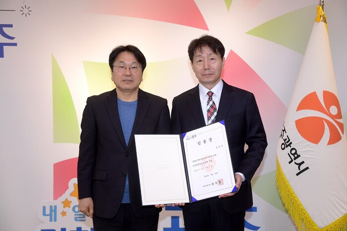 | ▲ 강기정 광주광역시장이 14일 오전 시청 접견실에서 정현철 보건환경연구원장에게 임용장을 전달한 후 기념촬영을 하고 있다./광주광역시 제공 |