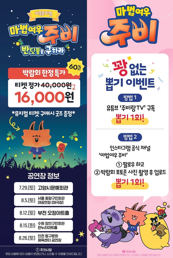 ‘마법여우 주비’ 캐릭터 라이선싱 페어 부스에서는 참가 기념으로 다양한 현장 이벤트를 진행한다. 이벤트로는 ▲꽝 없는 100% 굿즈 경품 증정 뽑기 ▲마법여우 주비 뮤지컬 티켓(5개 지역) 60% 파격 할인 등이 있으며, 추가로 ㈜아소비교육에서 출간한 받침 없는 특허 동화책 1단계 시리즈를 현장에서 만나볼 수 있다. 본 한글 동화책에는 주비 캐릭터가 주인공으로 출연한다.