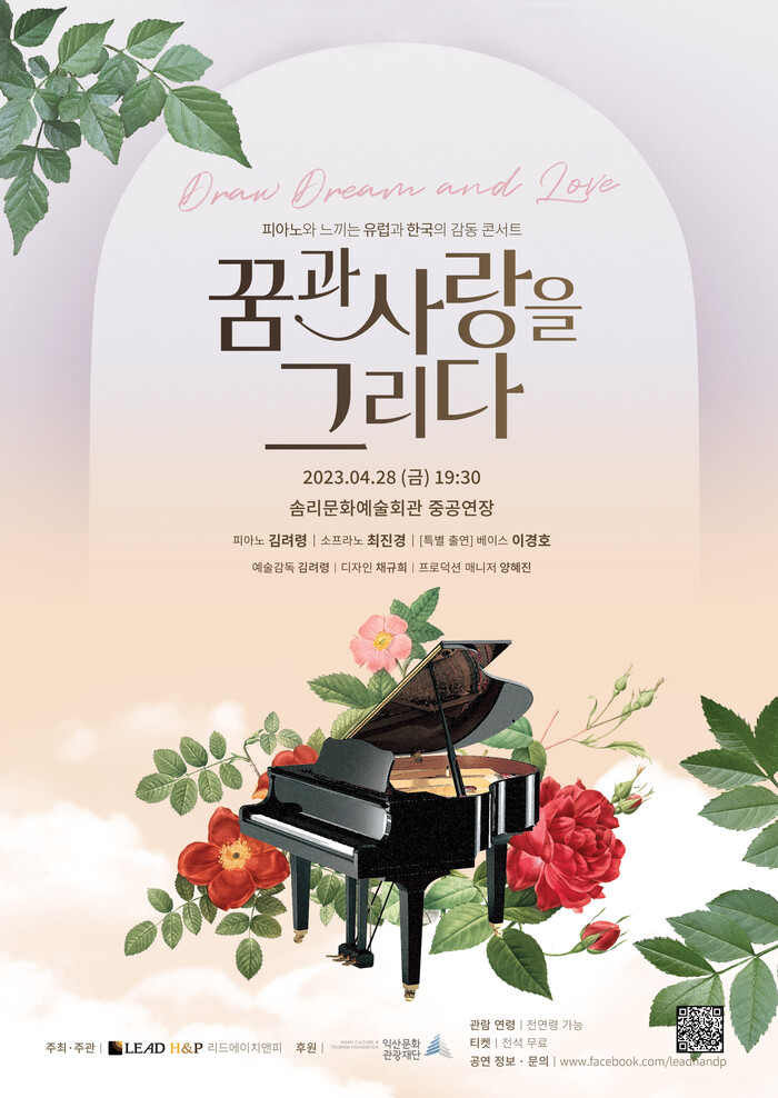 [익산=황승순 기자]LEAD H&P(리드에이치앤피)가 주최/주관하고 익산문화관광재단이 후원하는 <꿈과 사랑을 그리다> 음악콘서트가 오는 28일 솜리문화예술회관 중공연장에서 공연된다.
