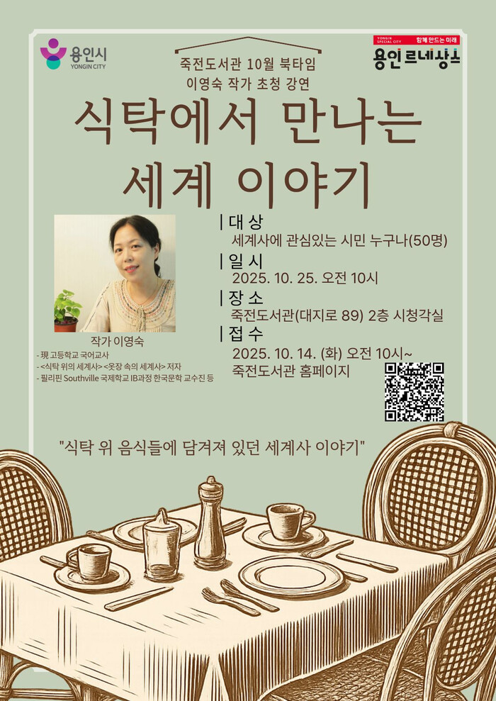 [용인=오왕석 기자] 용인특례시(시장 이상일)는 25일 오전 10시 죽전도서관 시청각실에서 죽전도서관 북타임 작가초청강연회 ‘식탁에서 만나는 세계 이야기’를 연다고 13일 밝혔다.