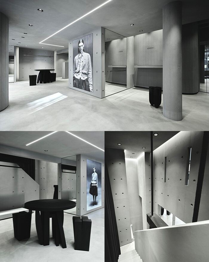 송지오 우먼의 파리 플래그십 스토어는 파리 마레 지구의 고전적인 오스만 양식의 건축물들 사이에서 현대적인 콘크리트 외관으로 강렬한 존재감을 드러낸다. 네오-브루탈리즘 건축 양식을 보여주는 이번 매장은 예술과 문화의 중심인 마레 지구에 위치해 파리의 고전적인 감성과 한국의 현대적인 미학이 조화롭게 어우러진 공간으로 패션을 넘어 건축과 예술이 만나는 장소이다.