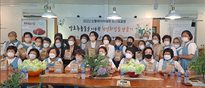 이번 교육은 장미경 (전)한국미용전문학교 조교수를 강사로 초빙해 지난 6월 20일부터 이달 8월 8일까지 8차례의 이론과 실습을 병행한 전문교육으로 동백꽃 발효유, 자소엽콤플렉스, 로즈마리, 어성초, 쑥 등의 발효추출물을 제조하고 이를 이용한 샴푸, 폼클렌징, 바디워시, 비타민C세럼, 로션 등 다양한 천연화장품 만들기 수업을 진행했다.