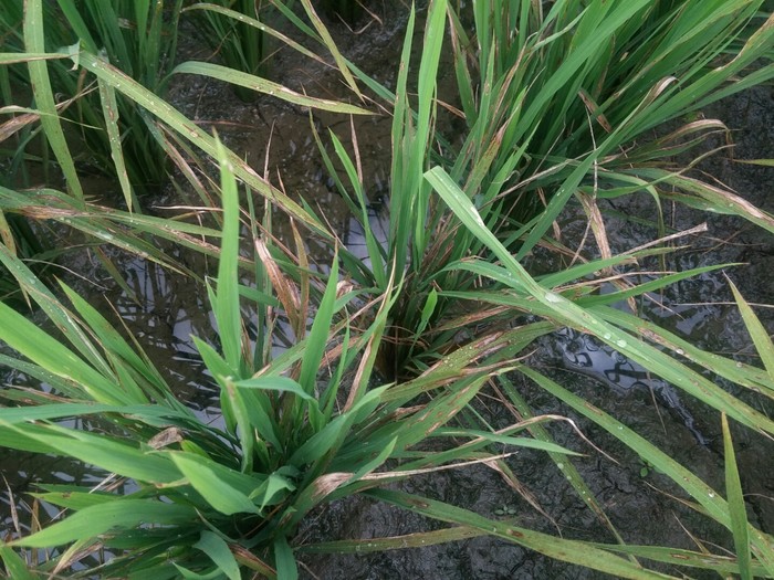 | ▲ 잎도열병에 말라가는 벼잎사귀 / 사진=강진군 제공 |