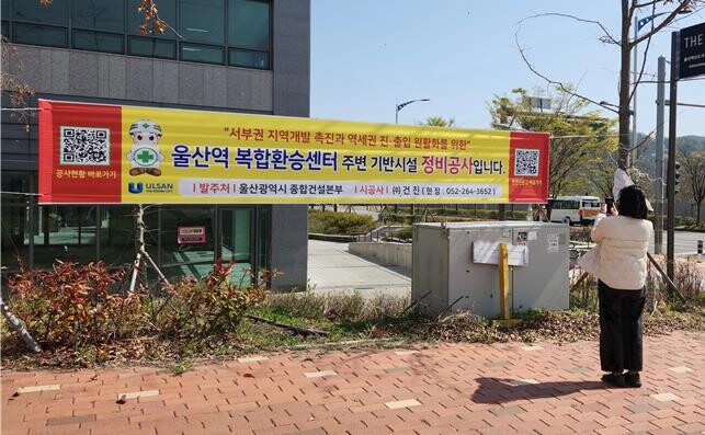 [울산=최성일 기자] 울산시는 정보무늬(QR코드)를 활용한 ‘지능형(스마트) 공사 알림 현수막’을 ‘울산역 복합환승센터 주변 기반시설 정비공사’ 현장에 시범 설치하였다고 밝혔다.