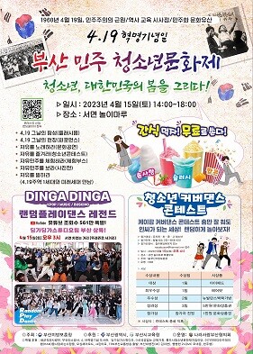 [부산=최성일 기자] 국가보훈처 부산지방보훈청(청장 전종호)은 오는 15일 오후 2시 서면 놀이마루에서 2023년 부산 민주 청소년 문화제 ‘청소년, 대한민국의 봄을 그리다!’를 개최한다고 밝혔다.