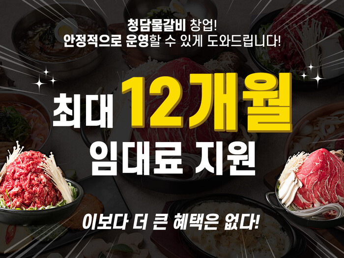 청담물갈비 본사 관계자에 따르면 “최근 물가 상승에 따라 유명 고기집브랜드 초기 창업비용은 최고점에 접어들며 예비창업자의 어려움은 가중되고 있다. 불황 속에도 청담물갈비 창업 의지가 강하신 예비 점주님들의 부담을 덜어드리기 위해 한시적으로 최대 12개월 임대료 지원 프로모션을 진행하게 되었다.”고 전했다.