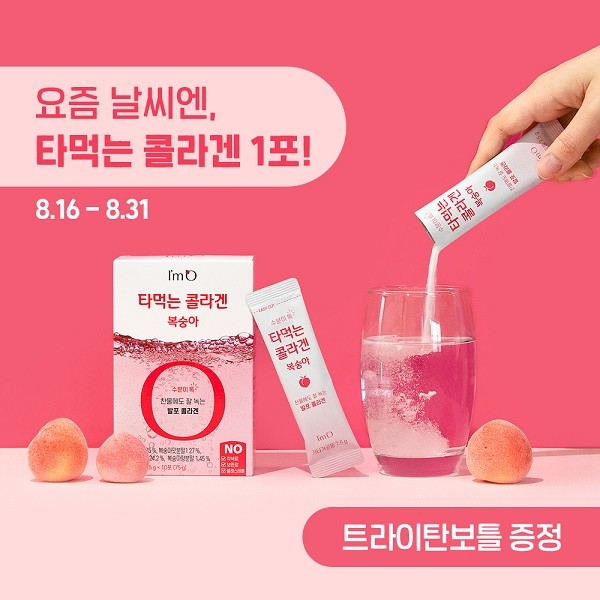 아임오 관계자는 “타먹는 콜라겐은 청량감을 느낄 수 있는 탄산 성분을 첨가하고 찬물에도 잘 녹을 수 있도록 설계했으며 복숭아맛과 유자맛 2가지 맛으로 골라먹는 재미가 있도록 한 제품이다”라며 “요즘 특히 운동을 하는 사람들에게 인기가 높은 제품이다”라고 전했다.