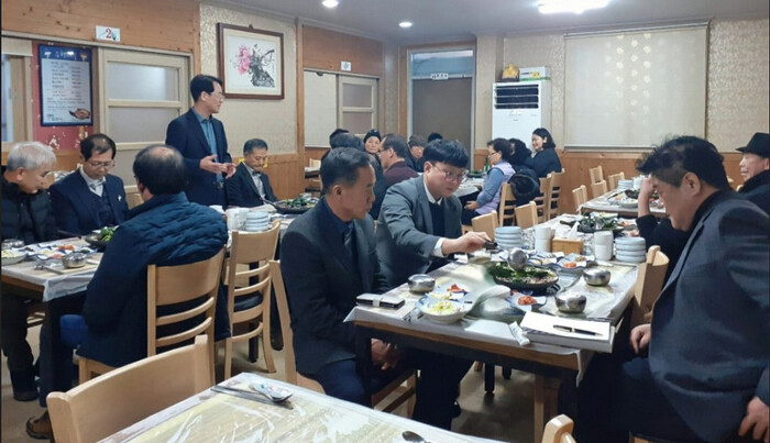 | ▲ 강진원 강진군수가 지난 15일 읍내 한 음식점에서 한국떡류식품가공업 강진군지부 회원들을 대상으로 떡 산업 활성화 및 발전 방안에 대한 설명을 하고 있다. / 강진군 제공 |