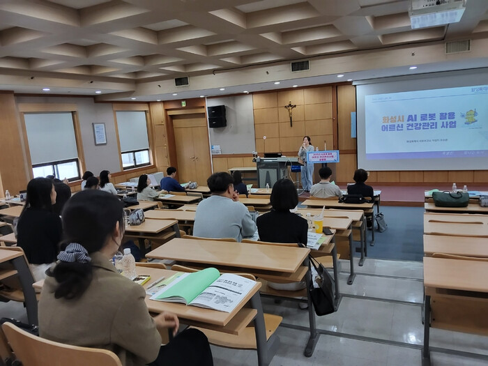 [화성=송윤근 기자] 경기 화성특례시가 28일 서울 가톨릭대학교에서 열린 경기도 및 경기도통합건강증진사업지원단 주관 ‘2025년 AI로봇 활용 어르신 건강관리사업 설명회’에서 ‘AI 기술을 활용한 어르신 건강관리 사례’를 발표했다.