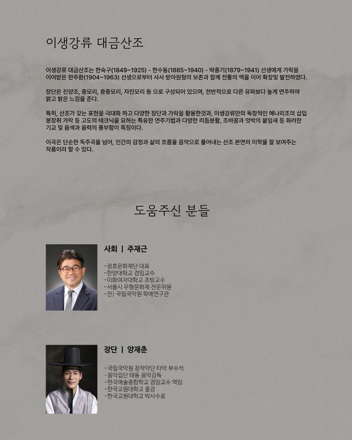 공연은 임정현이 주최하며, 국가무형문화재 전수교육관과 정효문화재단이 후원하는 이번 공연은 임정현이 오랜 시간 갈고닦은 이생강류 대금산조 전 바탕을 선보이는 자리다. 전통 산조의 깊은 음악성과 그 흐름을 현대의 감성으로 풀어내는 무대가 될 예정이다.