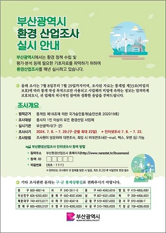조사 대상은 2023년 12월 31일 기준으로 부산시 소재에서 환경산업 활동을 수행하고 있거나 수행했던 종사자 1인 이상의 모든 사업체로, 8천여 개 사업체가 해당한다.