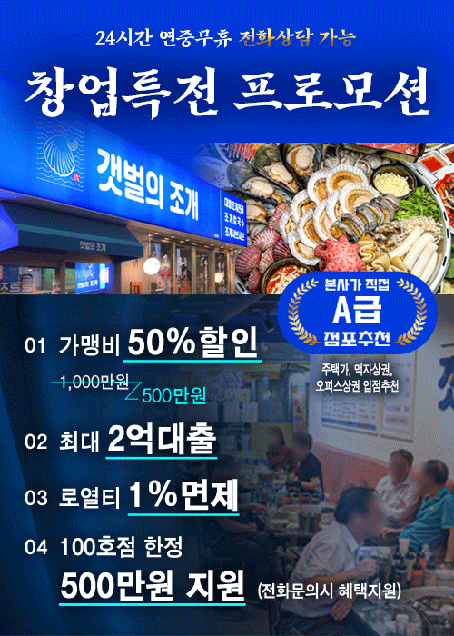 브랜드 관계자는 “술집, 조개 집, 해산물 식당 등 요식업창업을 계획하는 소자본창업자와 업종 변경을 희망하는 자영업자들에게 가맹비 50% 할인, 로열티 1% 면제, 창업 대출 2억원, 전화 상담 시 마케팅 비용 500만원 지원 등의 혜택을 100호점 한정으로 제공하고 있다”라고 말했다.